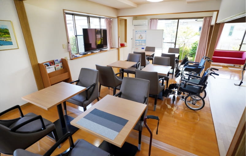 お食事をとったり、他の利用者様と雑談やレクリエーションを行うメインルームです。